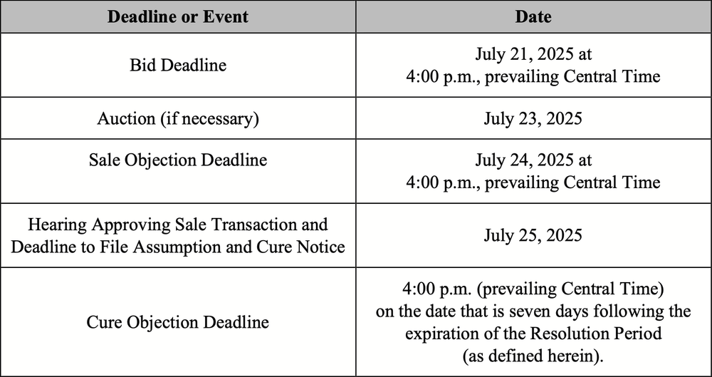 The Debtors initiated a court-supervised sale process for substantially all assets, with the DIP Lenders as the WholeCo Stalking Horse Bidder, aiming for a sale hearing by July 25, 2025.