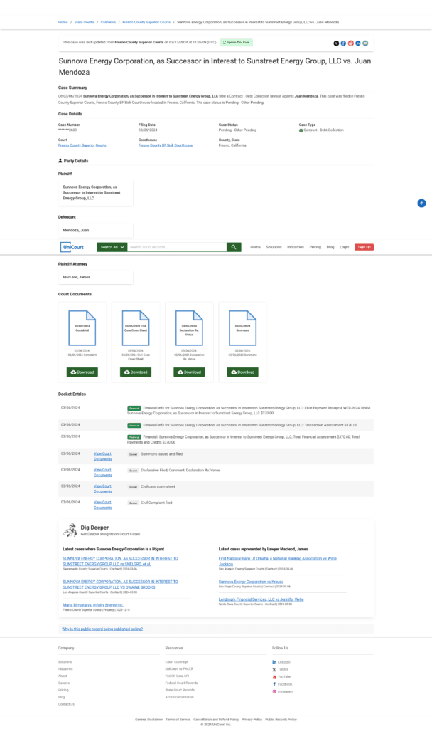 On 03/06/2024 Sunnova Energy Corporation, as Successor in Interest to Sunstreet Energy Group, LLC filed a Contract – Debt Collection lawsuit against Juan Mendoza. This case was filed in Fresno County Superior Courts, Fresno County BF Sisk Courthouse located in Fresno, California. The case status is Pending – Other Pending.